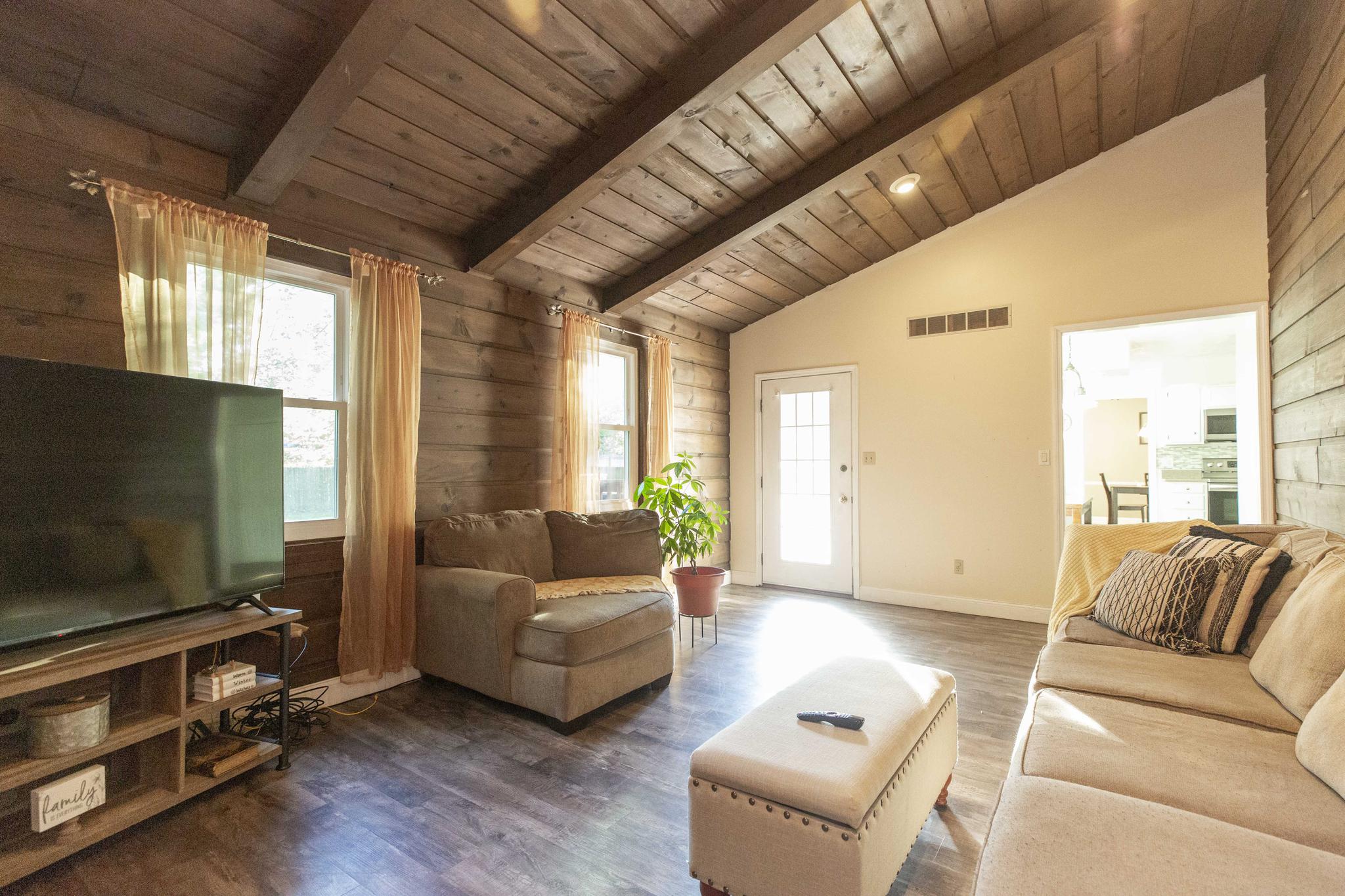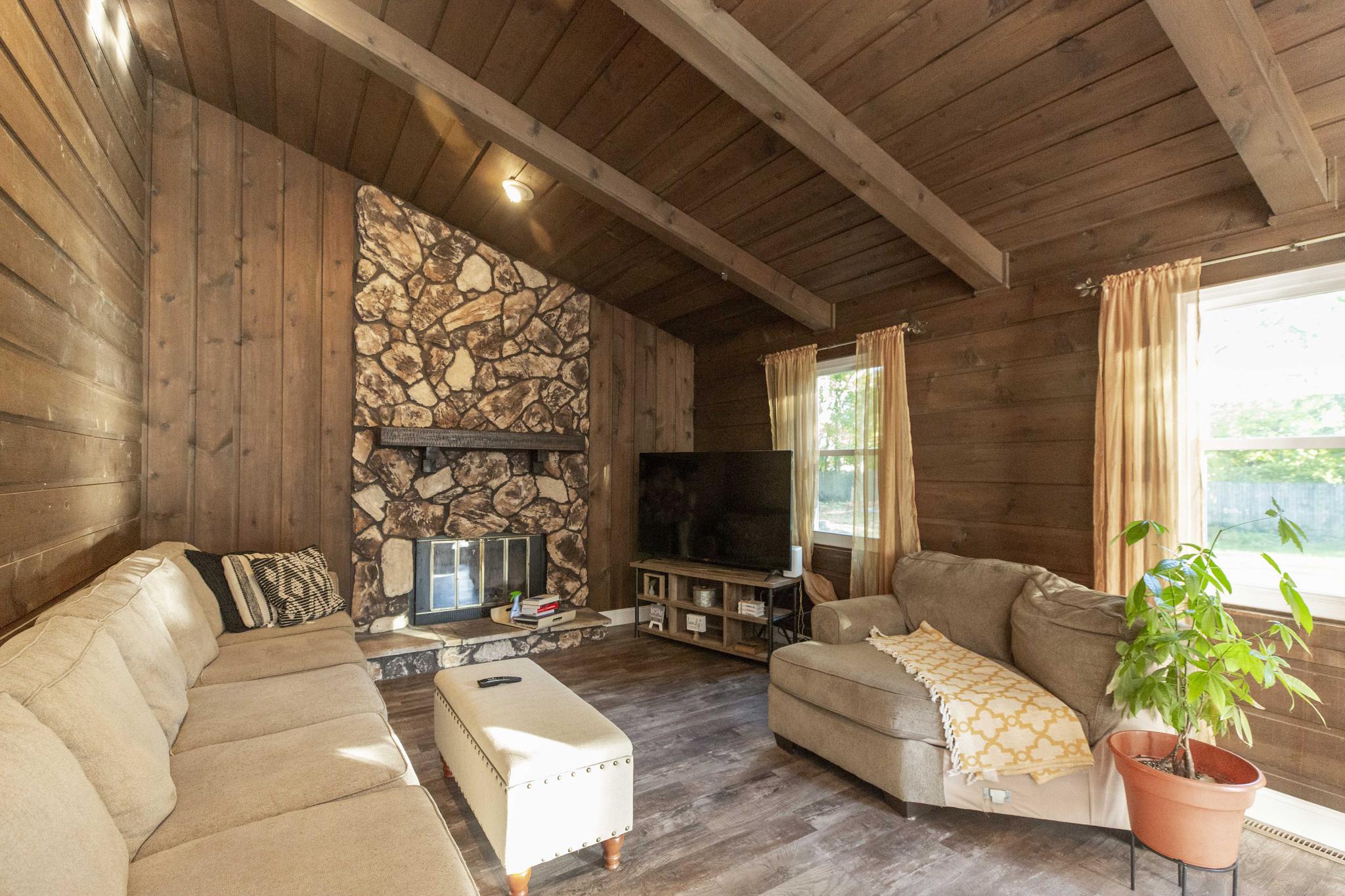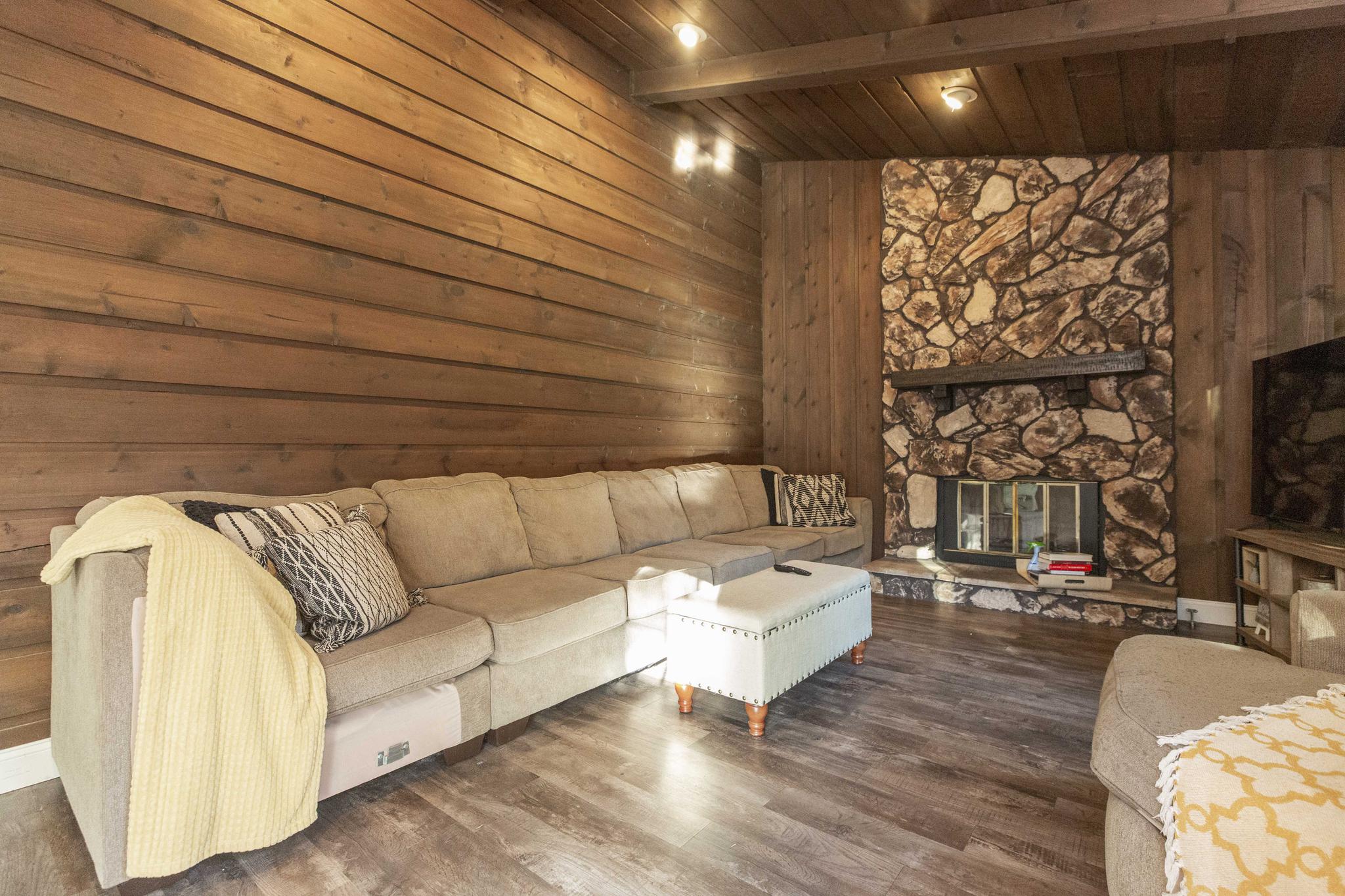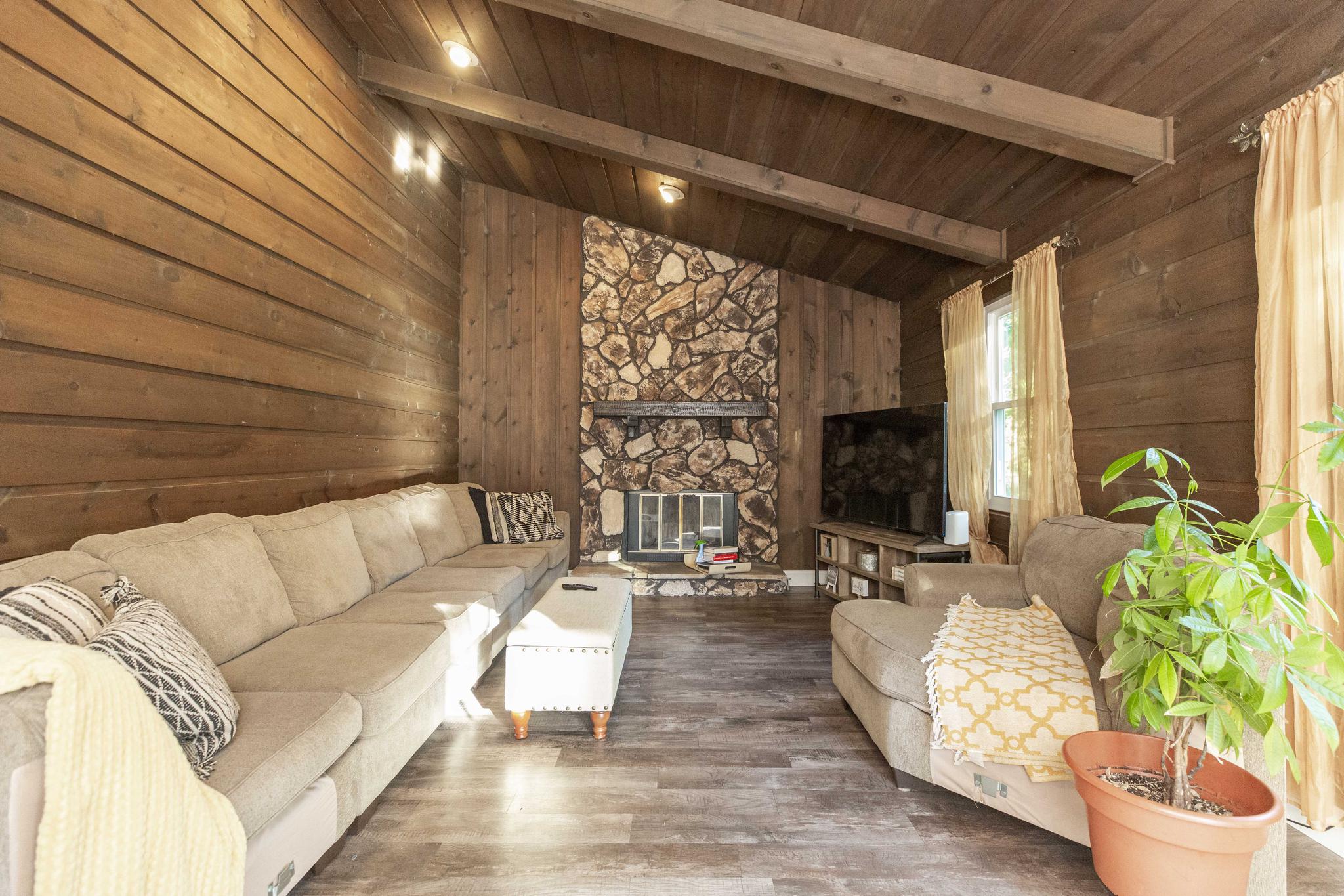 Spacious vaulted family room with stone-faced wood-burning fireplace