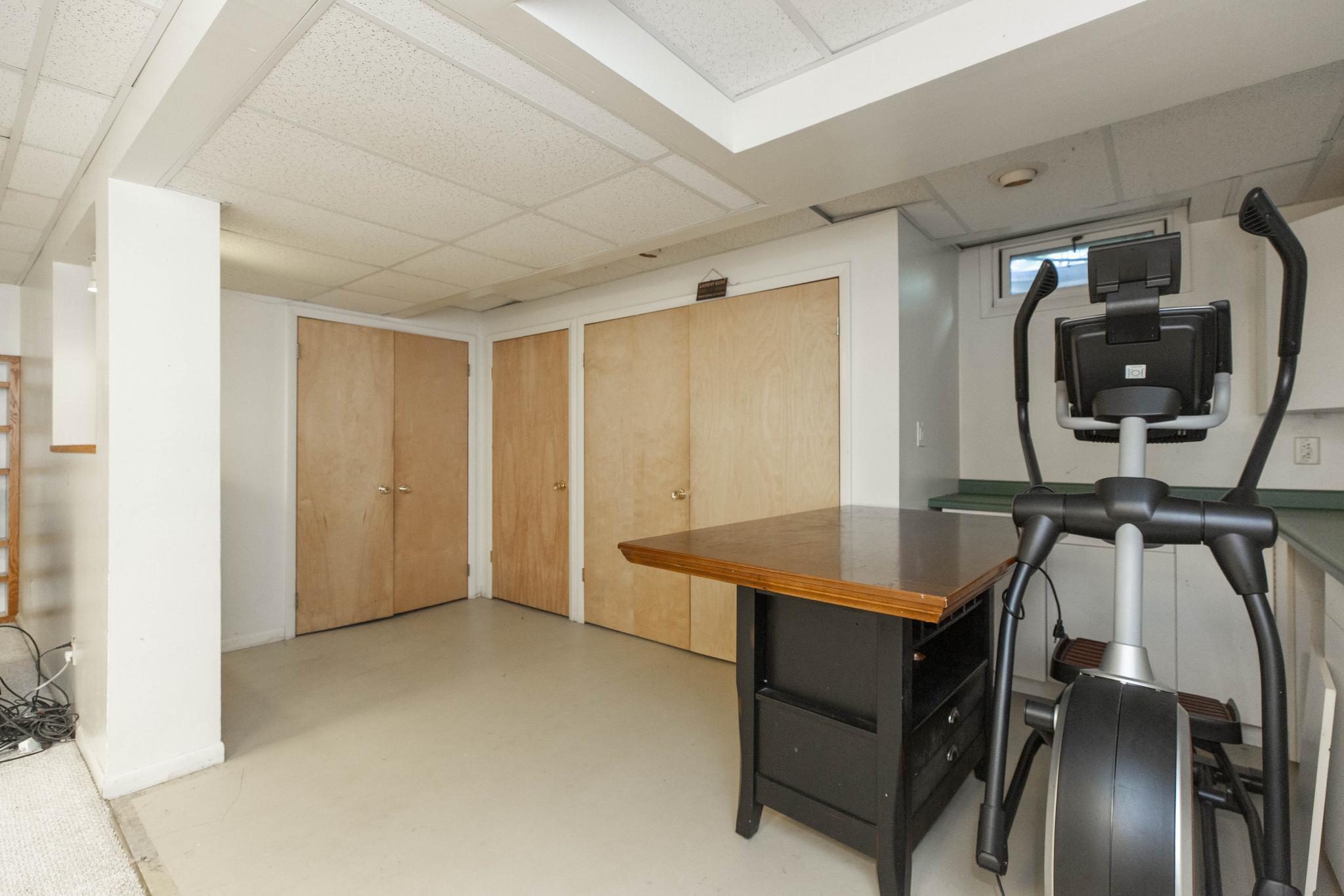 Finished basement with built-in cabinets, large closet, and entertainment space